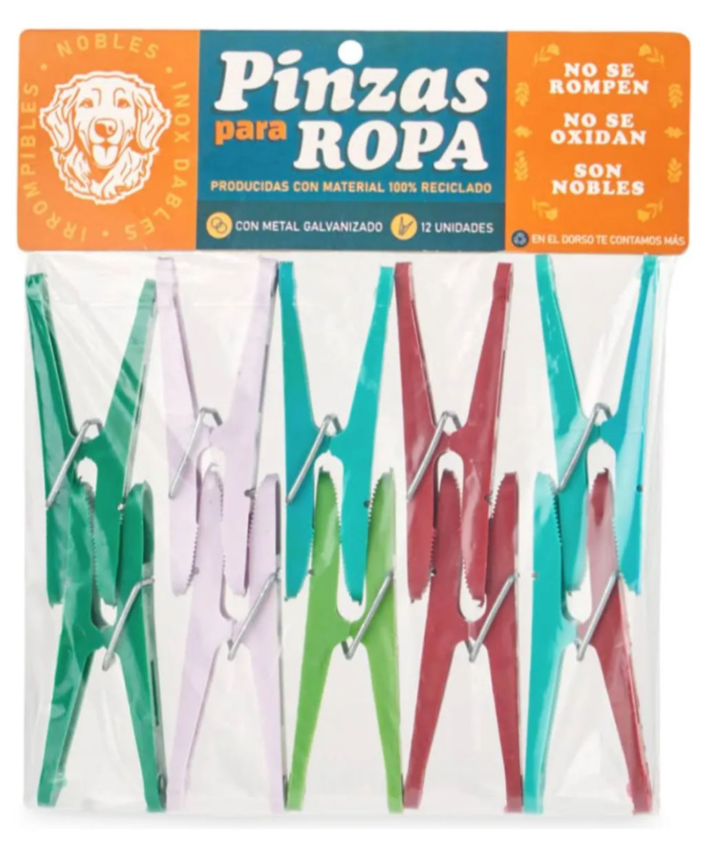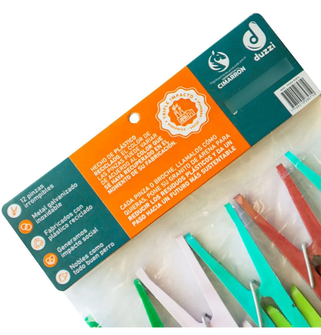 Pack x 12 broches o Pinzas para ropa, fabricados con PLÁSTICO RECICLADO, generando un impacto social positivo y un alambre galvanizado, garantizando que no se oxide