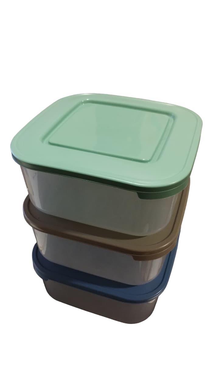 JUEGO DE 5 TAPERS / RECIPIENTES HERMETICOS CUADRADOS DE 500CC, APTO FREEZER Y MICROONDAS Los colores son surtidos según stock al momento de compra. Los recipientes son transparentes, el color es de la tapa que varia entre azul, verde y beige Medidas superior: con tapa puesta 11,5cm por lado y 6.5cm de alto Medidas inferior: 10cm de lado SON APILABLES!