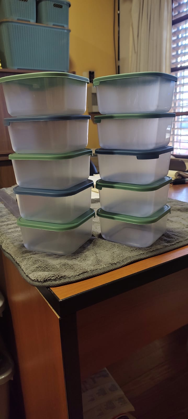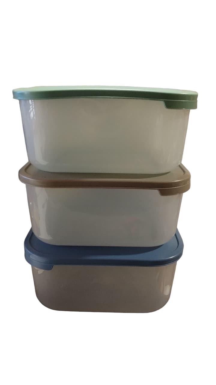 JUEGO DE 20 TAPERS / CONTENEDORES DE PLASTICO APTO ALIMENTOS / FREEZER Y MICROONDAS FORMATO CUADRADO MATERIAL PP5 MEDIDAS SUPERIOR CON TAPA ALTO 6,5CM X ANCHO 14,5 X PROFUNDIDAD 14,5CM MEDIDAS INFERIOR 12CM POR LADO IMPORTANTE LOS COLORES DE LAS TAPAS VARIAN ENTRE AZUL, VERDE O BEIGE. LAS TAPAS VIENEN CON UNA MARCA DONDE APOYA LA BASE DE OTRO CONTENEDOR, QUE LO HACE APILABLE.